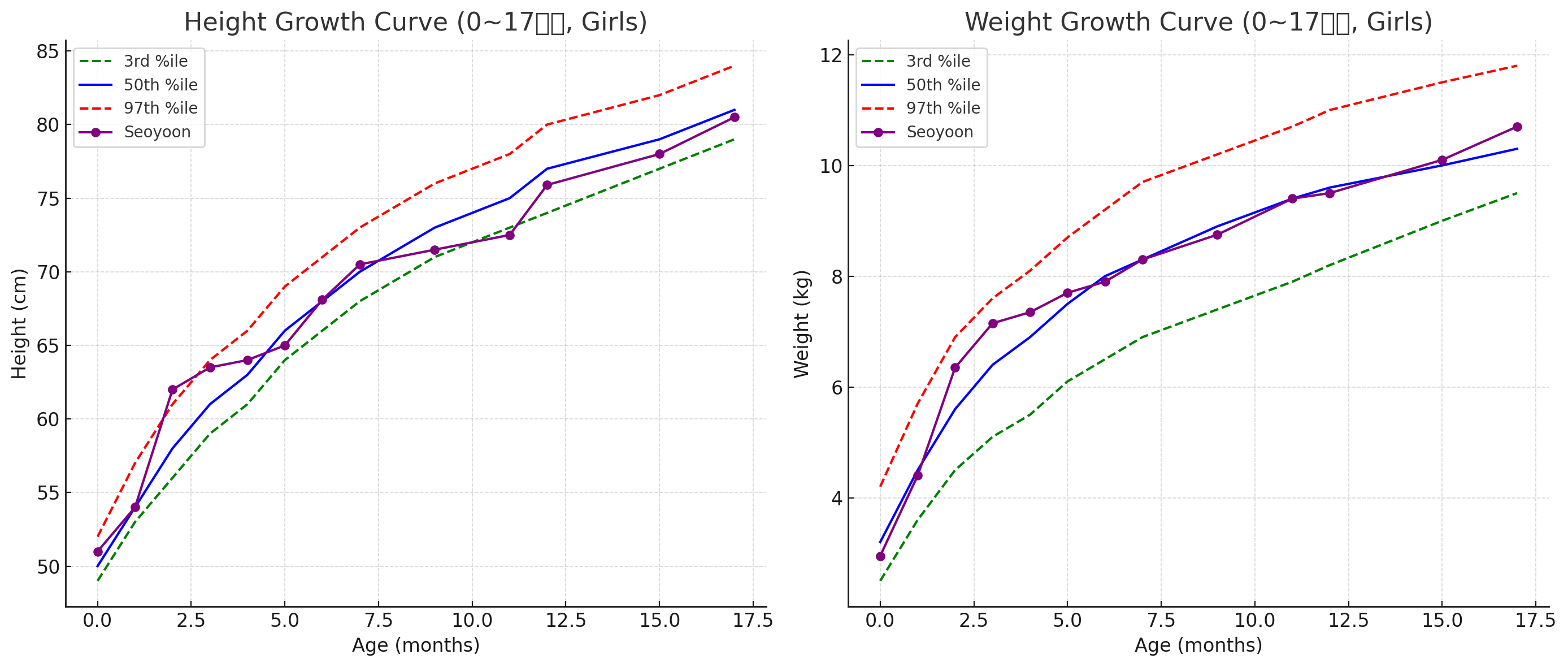 그래프로 보면 성장 흐름이 더 잘 보여요. WHO 성장곡선과 비교해도 서윤이는 항상 정상 범위 안에서, 평균보다 살짝 위쪽을 따라가고 있답니다.
